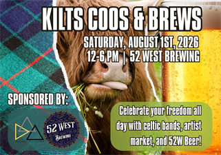 Get your Braveheart on at 52 West Brewing Saturday August 1st, 2026 at KILTS, COOS, & BREWS! It's an all day celebration of all things Scottish with special musical guest LANDLOCH'D, DAA Art Market, and delicious 52 West brews! Don't miss out! Learn more about all of the fun at artsdahlonega.org!